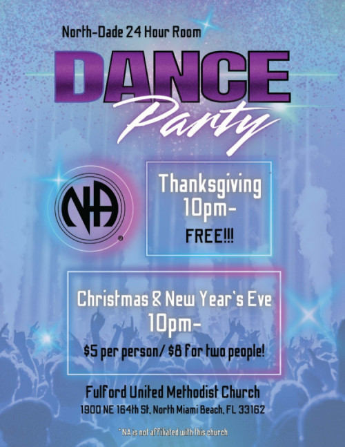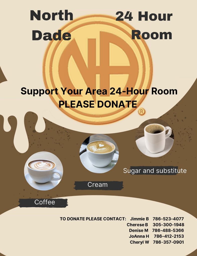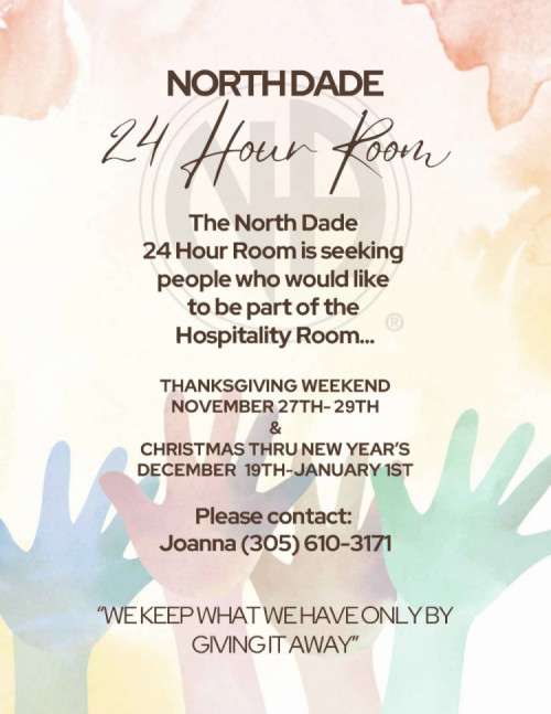 The North Dade Area 24 Hour Room Ad Hoc Committee provides a place for addicts to fellowship with each other during the holiday season, so that no addict need be alone.  The committee establishes a location for addicts to meet, arranges group meetings and accepts food, drink and coffee donation from groups and NA members.